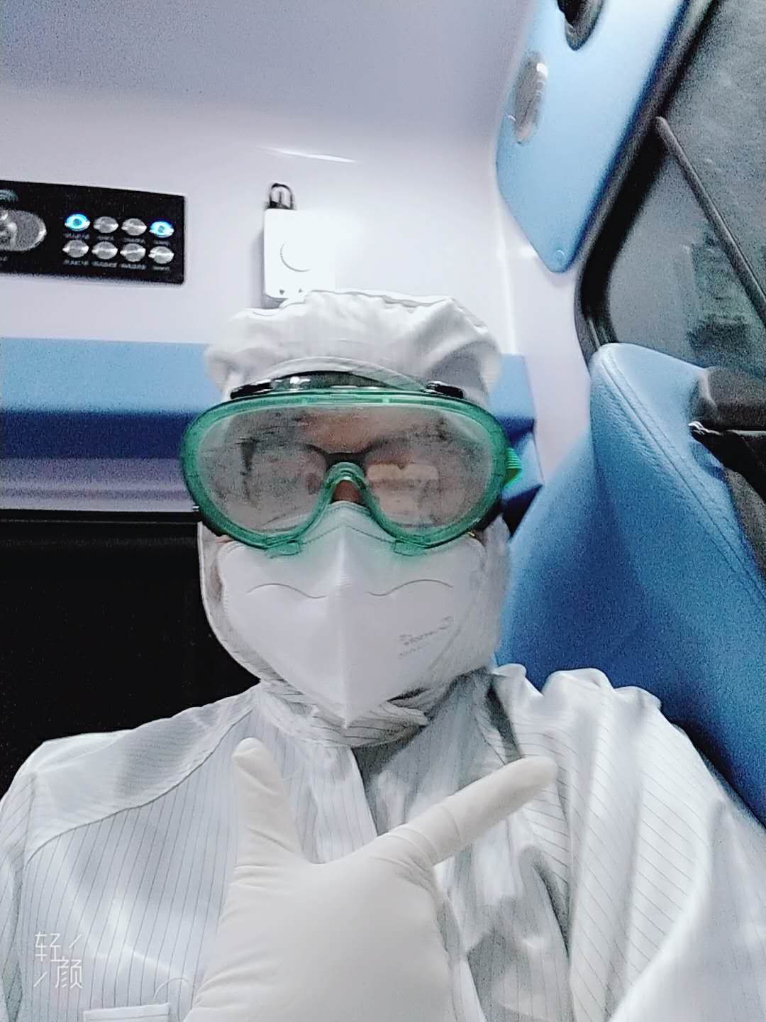 这是疫情的第一年 ,作为在急诊120工作的我,在转运一名密切接触者返程后拍的照片。在救护车的车厢里。密不透风的隔离衣,紧贴着脸的护目镜,还有紧捂的N95口罩。身上闷了一身汗,雾气模糊了戴眼镜的双眼 ,几乎都看不清。不过能安全将密接人员转运到隔离点,一切的不适又算得了什么。一切都值得。