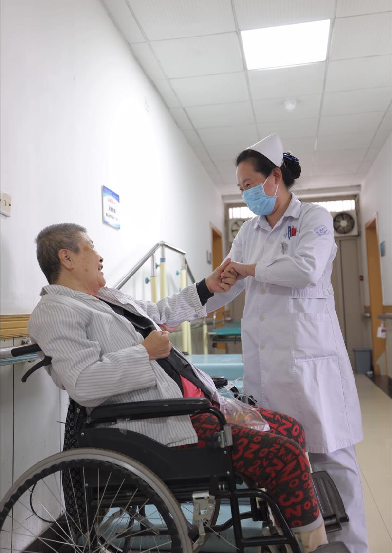 2023年5月护士节前夕,康复科护士在一边安抚等待做康复训练的患者大娘,一边给她做复健活动