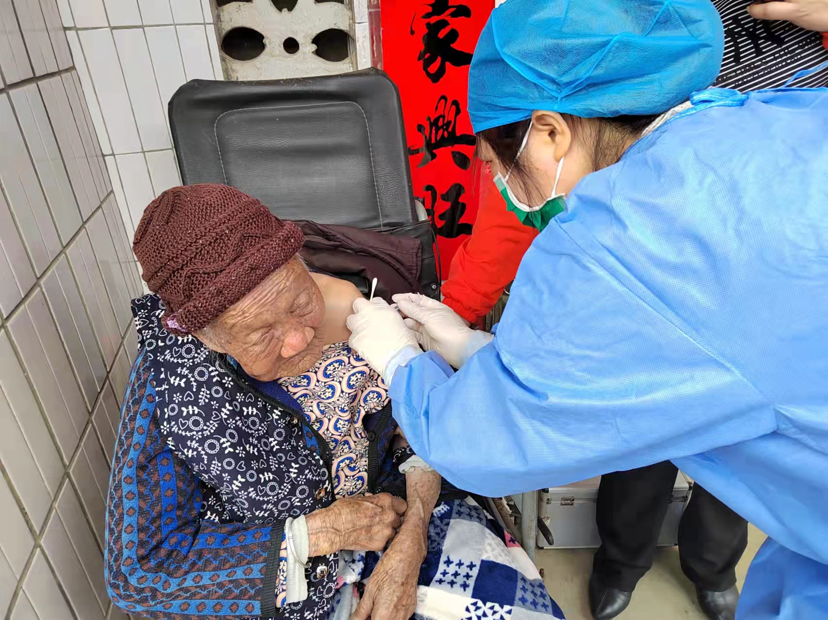 疫情期间,为加速疫苗接种的全履盖,促进老年群体增强对新冠病毒的抵抗力,医院釆取上门服务的模式,让老年群体的疫苗接种服务延伸到家,图为上门为90多岁老人接种新冠疫苗。