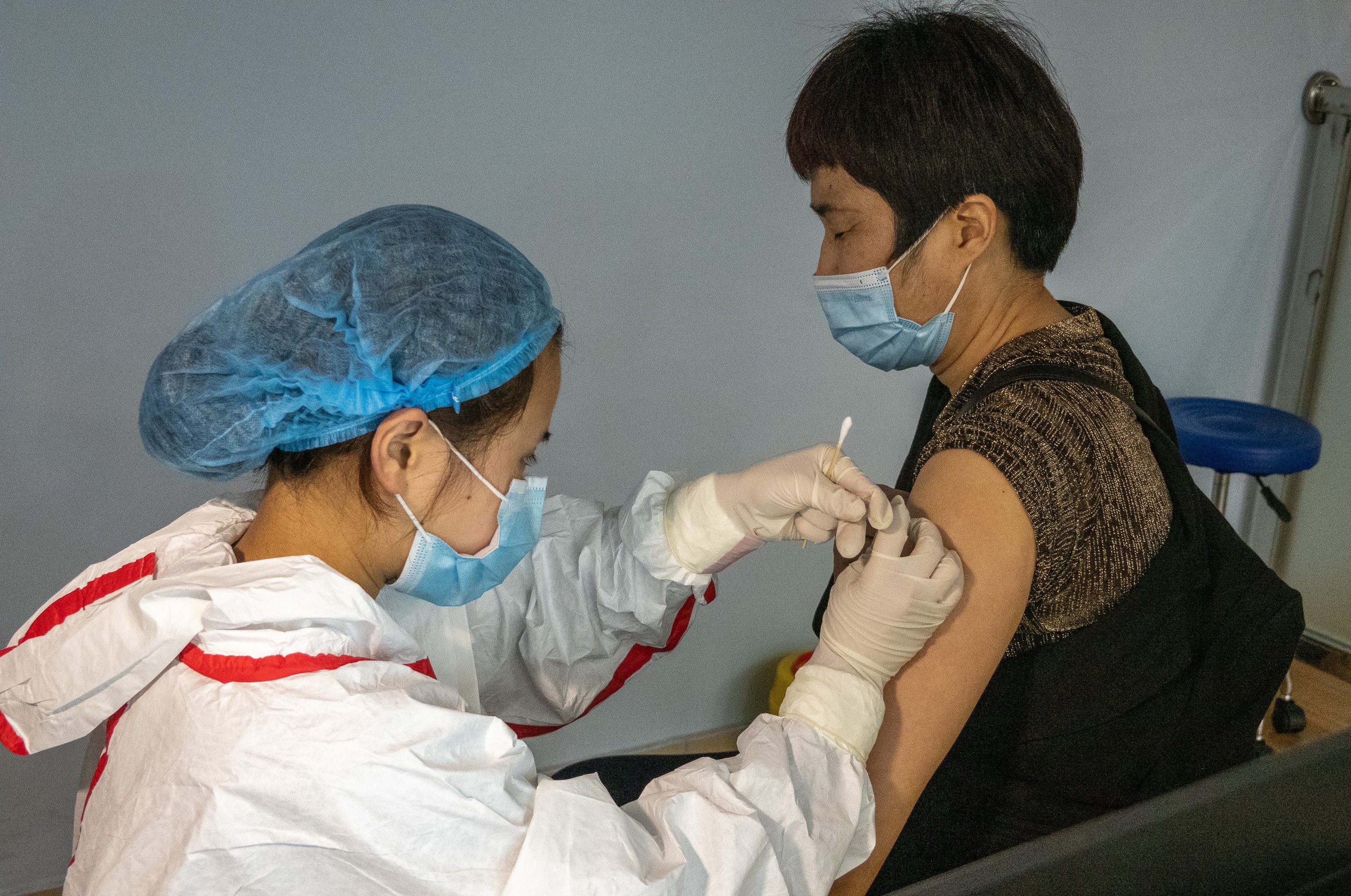 2021年4月12日,泸州奥体中心蓝球馆,接种人员为市民接种新冠疫苗。