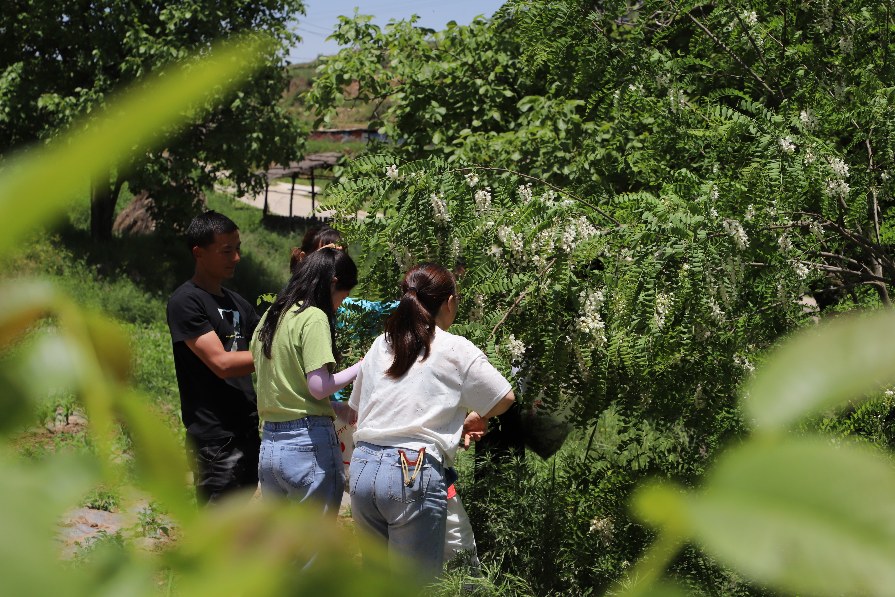 医护人员在下村工作之余采摘槐花。